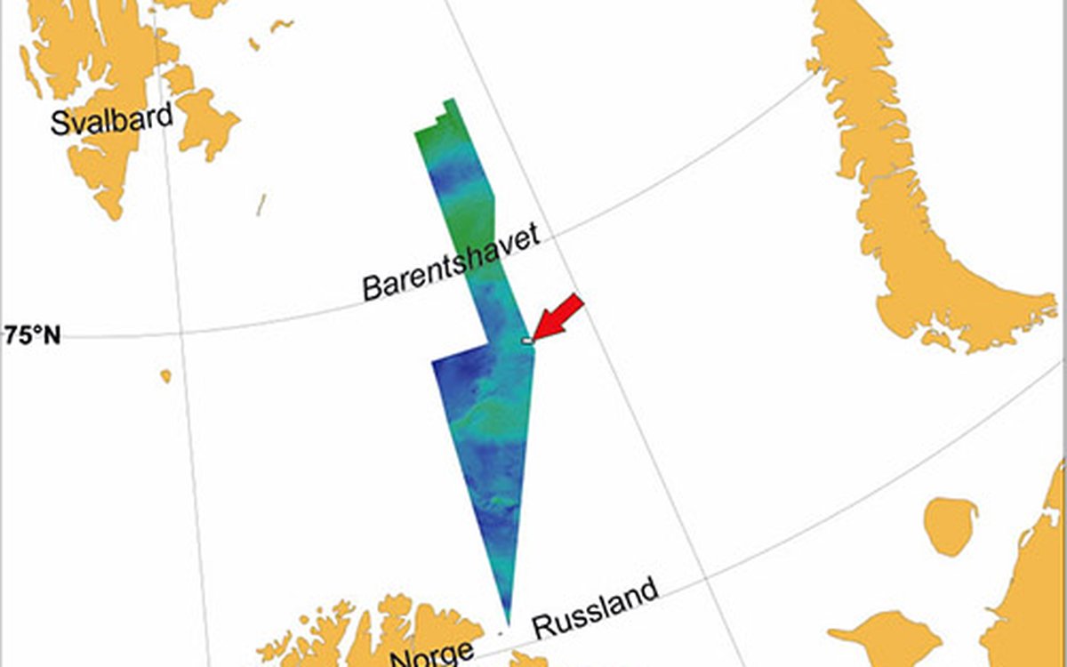 I GRENSELAND: Oversiktsbilde over viser hvor vi kan se godt bevarte elvekanaler på havbunnen (rød pil), midt i Barentshavet ved grensa til Russland.