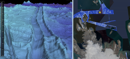 NORDENSKIØLDBUKTA: Illustrasjonene viser terrengmodeller basert på nye data som ble samlet inn i 2016 av MS Hydrograf og tilhørende arbeidsbåter i farled inn til Rijpfjorden. Området er Nordenskiøldbukta nord (sør av Sjuøyane), på vei inn mot Rijpfjorden. Dybdeforhold er 0 til 180 meter. Kilde: Kartverket/MAREANO