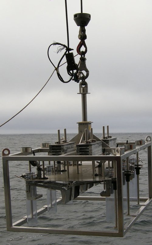 Multicoreren senkes ned til bunnen, og seks rør presses ned i sedimentene for å få opp sedimentkjerner.
