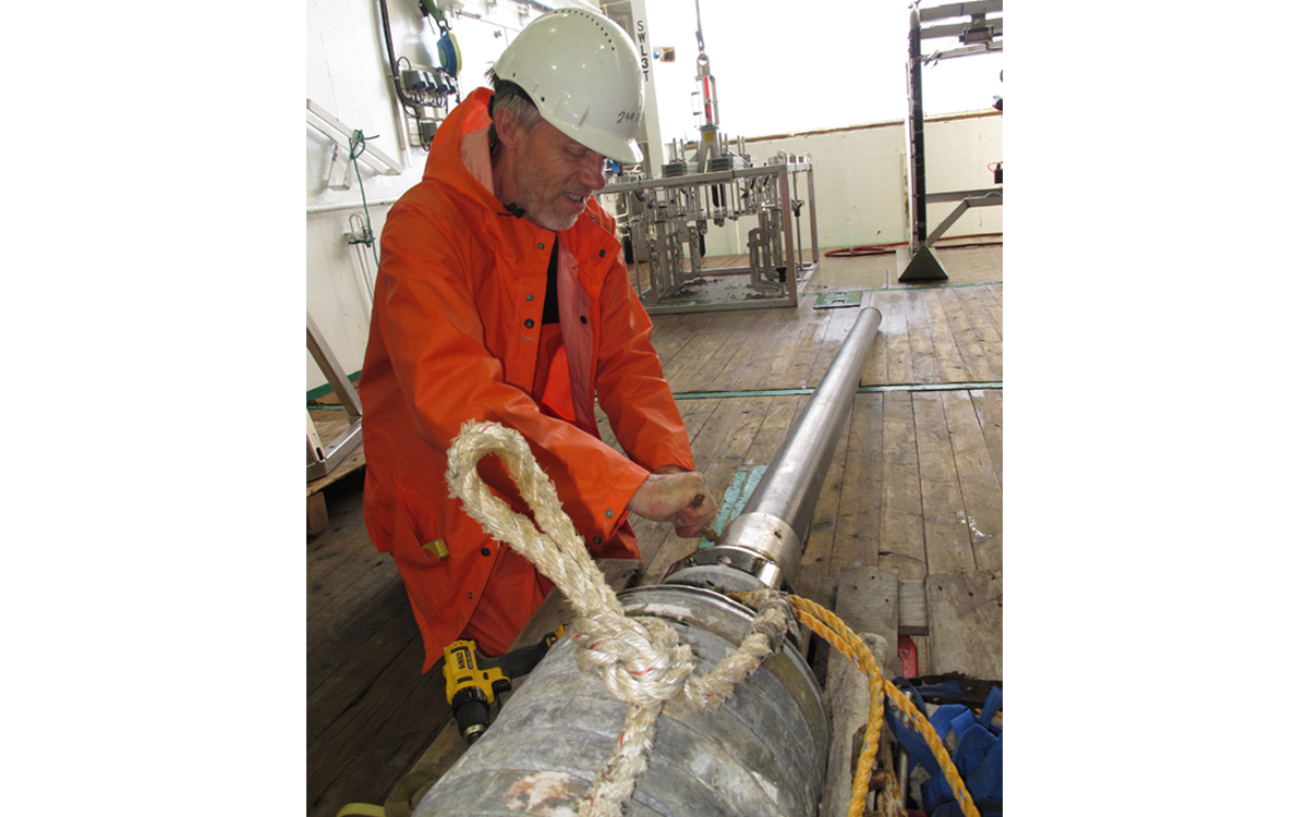 Marin geokjemiker Henning Jensen (NGU) klargjør en kjerneprøvetaker som samler inn prøver ned til 3 meter under havbunnen. 400 kg blylodd trykker prøvetakeren 3 meter ned i bunnmudderet. Prøven ble tatt på 460 meters dyp i Sklinnadjupet og gir informasjon om bunnforohldene flere tusen år tilbake i tid.
