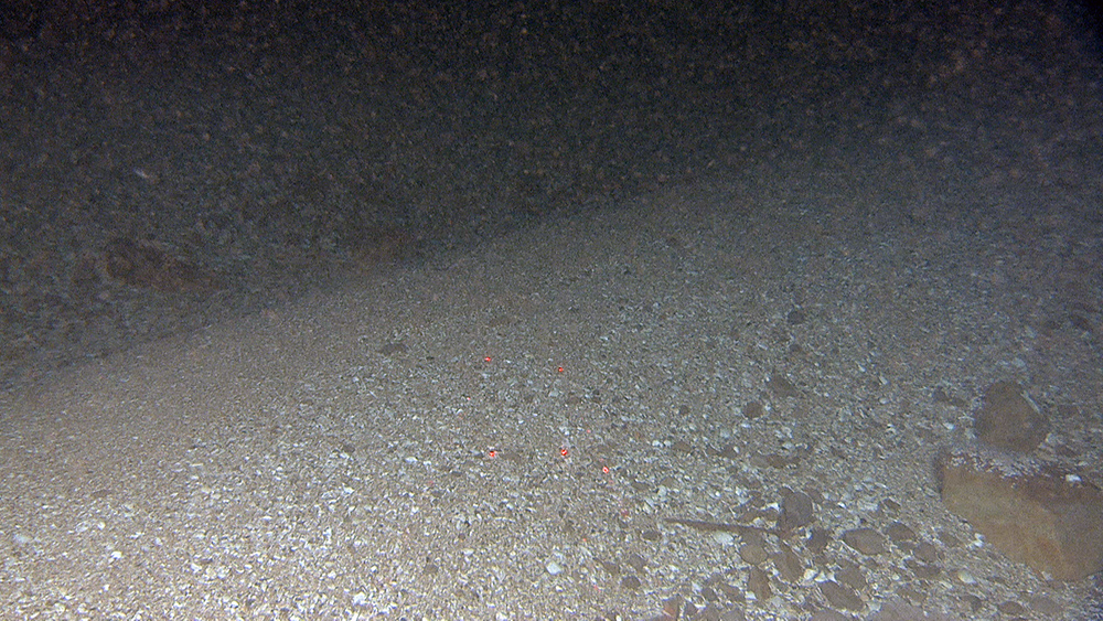Wave ripples have parallel crests on bathymetry maps and show a quite regular pattern. They mostly occur in shallow areas, as they need strong wave currents to form. Here, the wave ripples are 15-20 cm high and a few hundred meters long. Bathymetry data from MAREANO/KartverketWave ripples comprising mainly of sand and gravel size shell fragments, with a typically symmetrical flat crest. Red laser dots are 10 cm apart. Wave ripple comprising of sand and gravel size rock particles and shell fragments. Some animals, such as the sea cucumber (Cucumaria), thrive in strong currents and can be ubiquitously found between wave ripples. Red laser dots are 10 cm apart.Wave ripples comprising of gravel (in the foreground). In the troughs between the wave ripples (light grey areas) we find sand ripples migrating at 90 degrees to the gravel ripples. Picture from low resolution overview camera with feet of the video rig to the left and to the right.Wave ripples trending from the left to the right. Picture from low resolution overview camera.