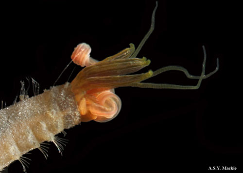 The story around the Pourtalesia commensal is a tale of many relationships. The bivalve was described recently as Syssitomya pourtalesiana but has been known for many years to be a commensal with Pourtalesia living attached to the spines around the anal opening. However, we have found this bivalve to be adapted to host symbiotic bacteria in the gills and is the first of the superfamily Galeommatoidea to exhibit this condition. Also on the gill surfaces are colonies of filamentous bacteria. We do not know what types these bacteria are, their energy source or their origin. We surmise that the bacilli are using faecal products from the urchin and that the filamentous bacteria may come from the faeces and are gathered and ingested by the bivalve. We have had limited success with collecting these animals, with four urchins and three bivalves our total so far.