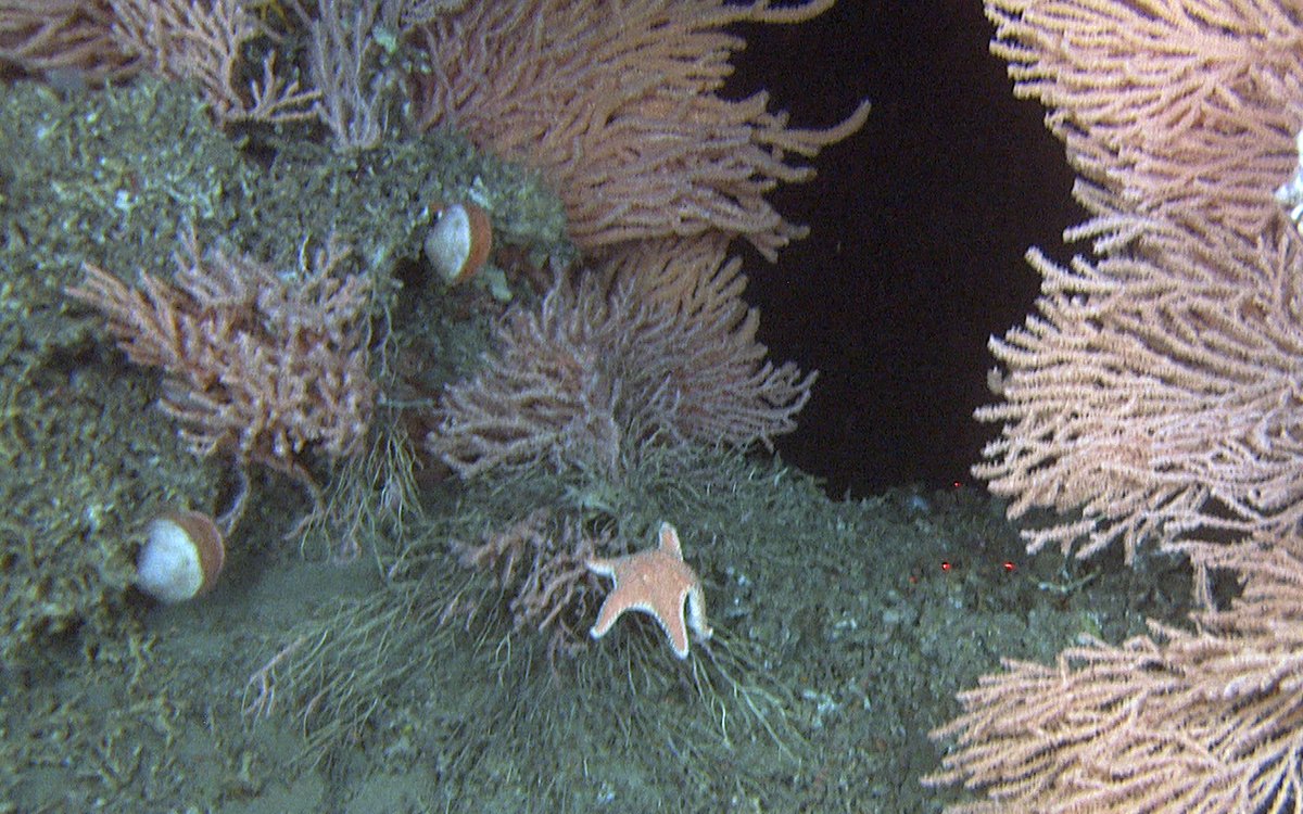 Risengrynkorall (Primnoa resedaeformis) er en hornkorall som er vanlig på de norske korallrevene. Her vokser de på døde korallskjelletter. I bildet ser vi også reirskjell (Acesta excavata) og sjøstjernen Hippasteria phrygiana. Foto: Mareano / Havforskningsinstituttet.