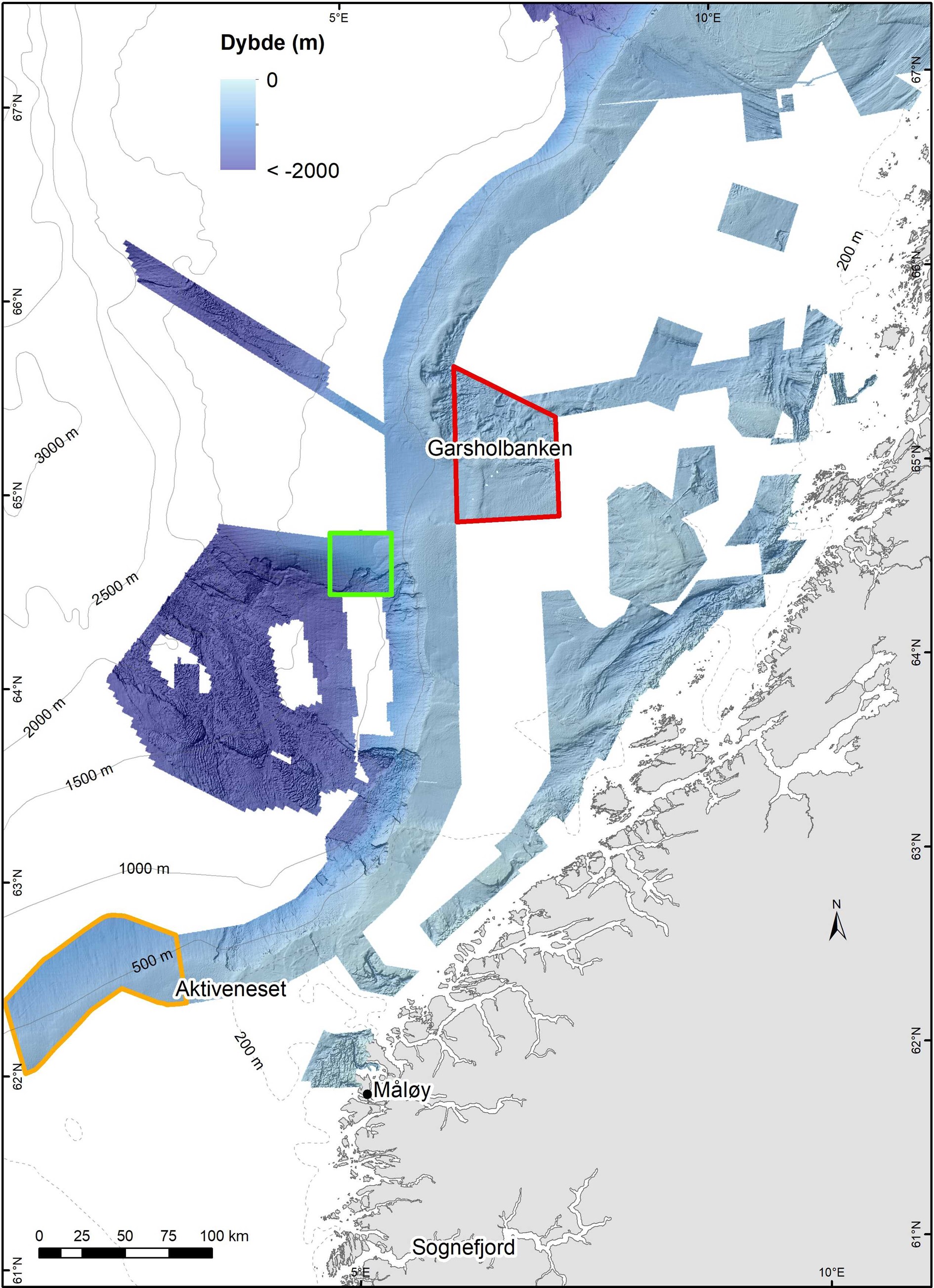 På skråningen sør-vest for Garsholsbanken skal vi undersøke 26 lokaliteter i et noe mindre område på dybder mellom 570 og 1200 m. Dette er i den nordligste delen av det undersjøiske rasområdet kalt Storegga. Området er og det første i en serie av tilsvarende bokser som er planlagt langs en linje utover i Norskehavet som del av kartlegging av de dypere deler av Norskehavet.