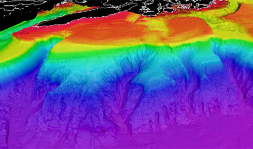 På skråningen utenfor kontinentalsokkelen vest av Andøya er det et variert landskap på dypt vann, med undersjøiske nes og raviner.