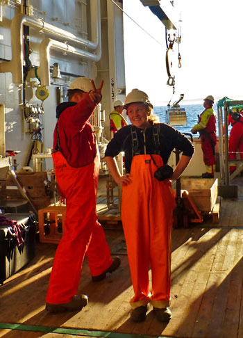 Jeg har fått varierte arbeidsoppgaver underveis på toktet, både inne på båten og ute på dekk. Oppgavene innendørs har blant annet vært videologging fra Campod'en som er en plattform med videokamera som filmer sedimenter og liv på havbunnen. Jeg har også hjulpet til med overvåking av Topas-kartlegging der et ekkolodd avbilder de øverste sedimentlagene på havbunnen og overvåkning av multistrålekartlegging som viser terrenget på havbunnen. Videologgene har vært veldig interessante å følge med på, og det er ikke alle som får sett havbunnen på 400 meters dyp på så nært hold. Jeg har funnet ut at sedimentkartlegging ikke er så enkelt - "muddy sand" og "sandy mud" ser ganske likt ut på videoen og gradvise overganger er vanskelige å få med seg. Mest spennende er uansett de grovere sedimentene med rikt dyreliv!