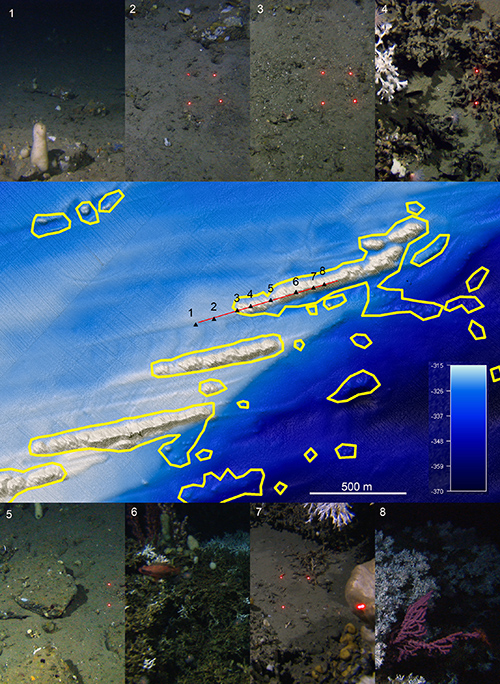 NGU kartlegger havbunnsedimenter i MAREANO-programmet. En av sedimenttypene er "bioklastiske sedimenter" som består av partikler dannet fra nedbryting av i hovedsak kalkholdige organismer, og kan inneholde alle kornstørrelser fra slam til blokker. De bioklastiske sedimentene danner mange steder haugstrukturer som har en randsone med varierende bredde, og kan være helt eller delvis dekket av levende koraller og andre organismer. Disse haugstrukturene er det mulig å kartlegge ved hjelp av multistrålebatymetri.